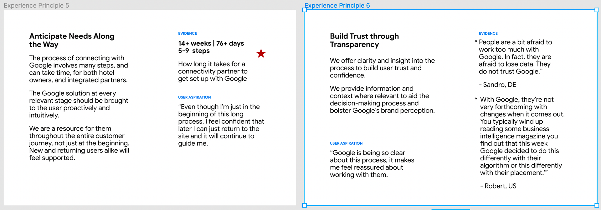 The team of visual designers and UX designers created a set of experience principles to guide the design. For each principle, we included quotes from the interviews to support the findings.